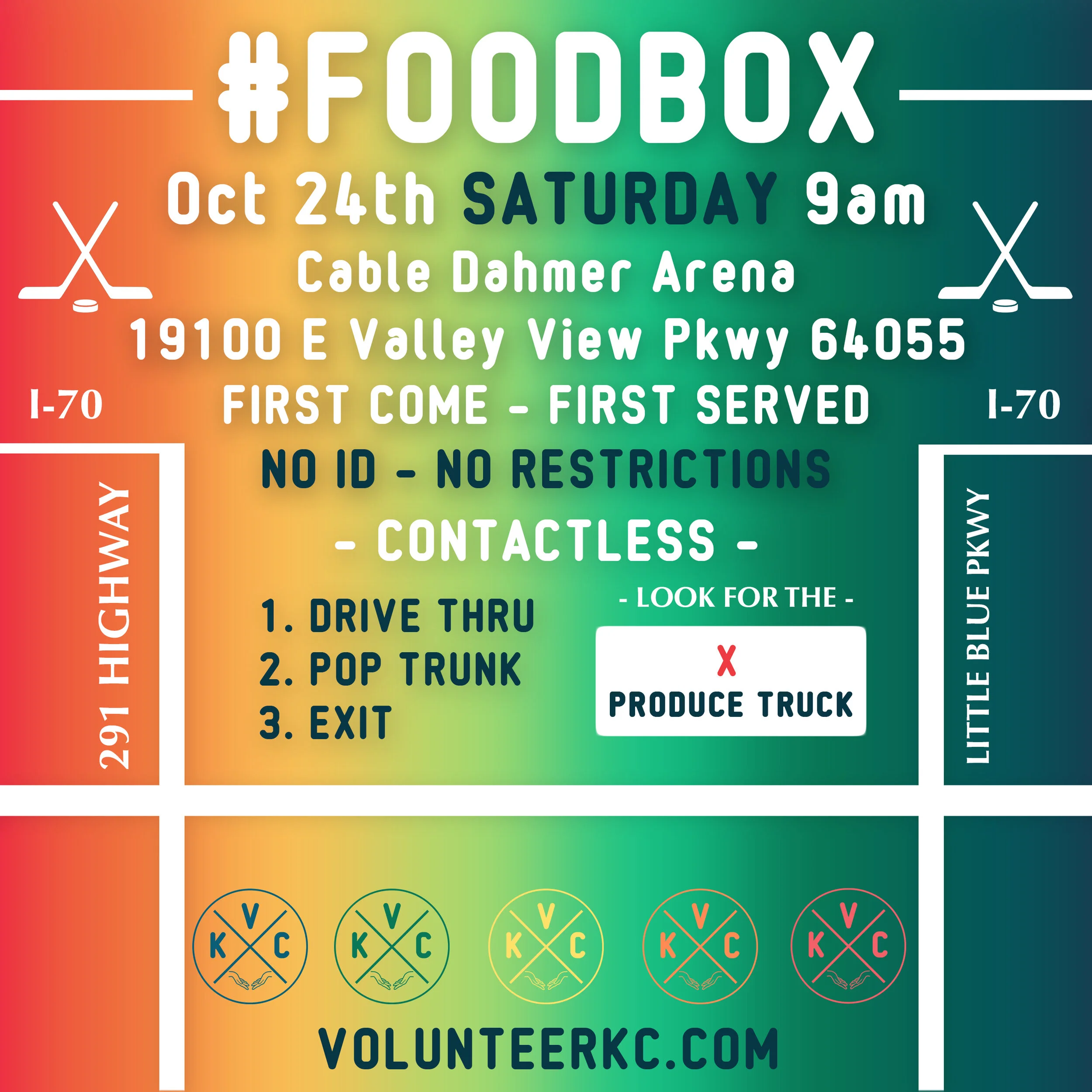 Please enter the arena parking lot from the East Entrance and wait for instruction. Food boxes will be loaded into the trunk unless otherwise noted.